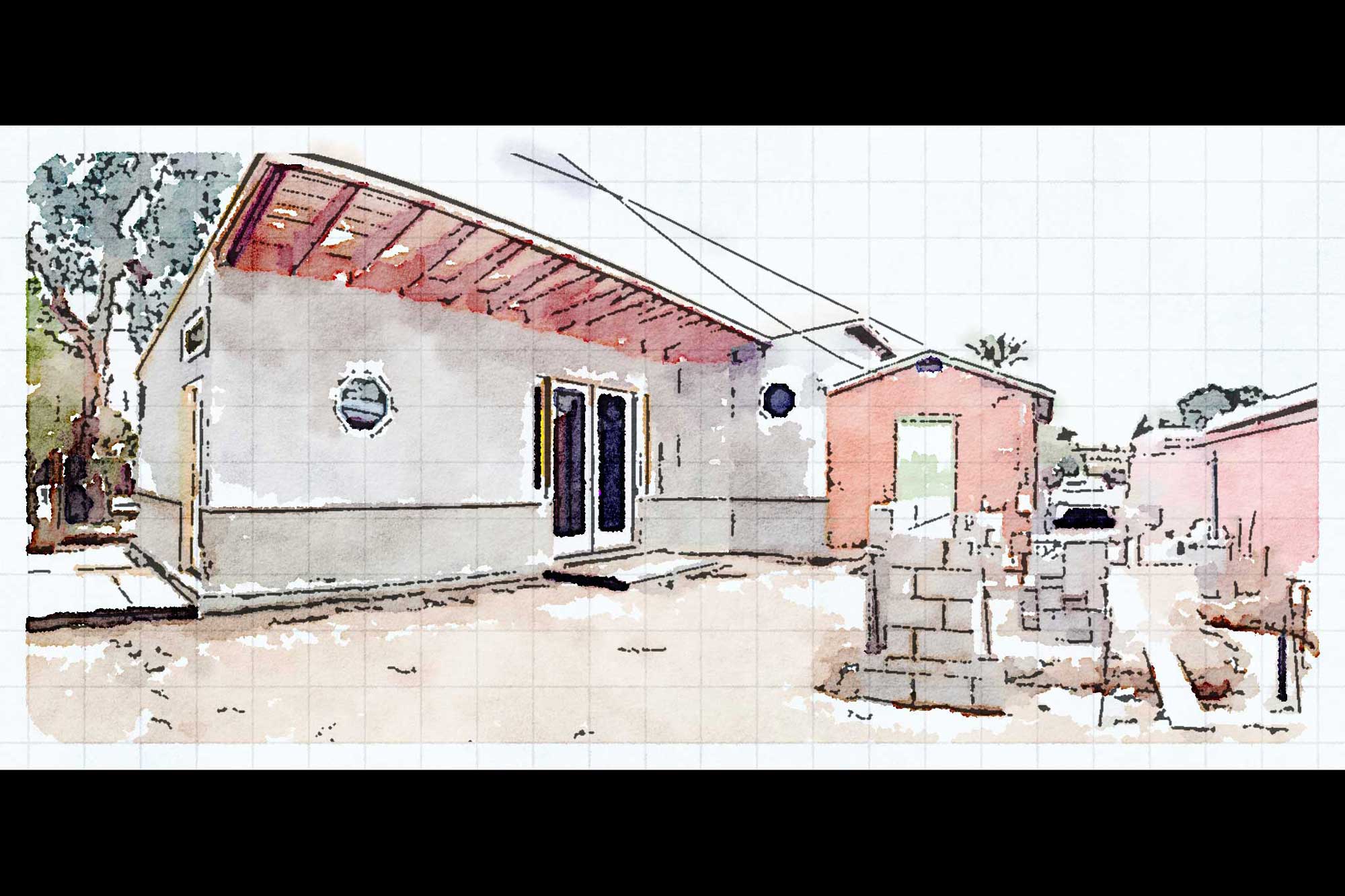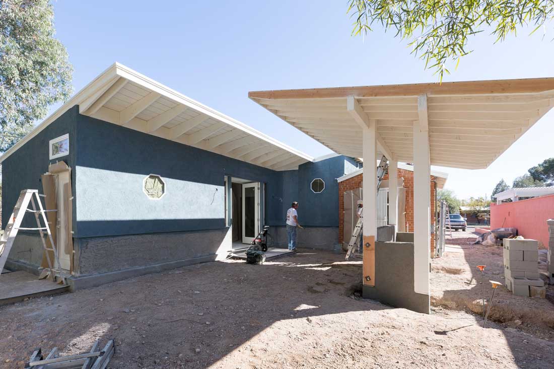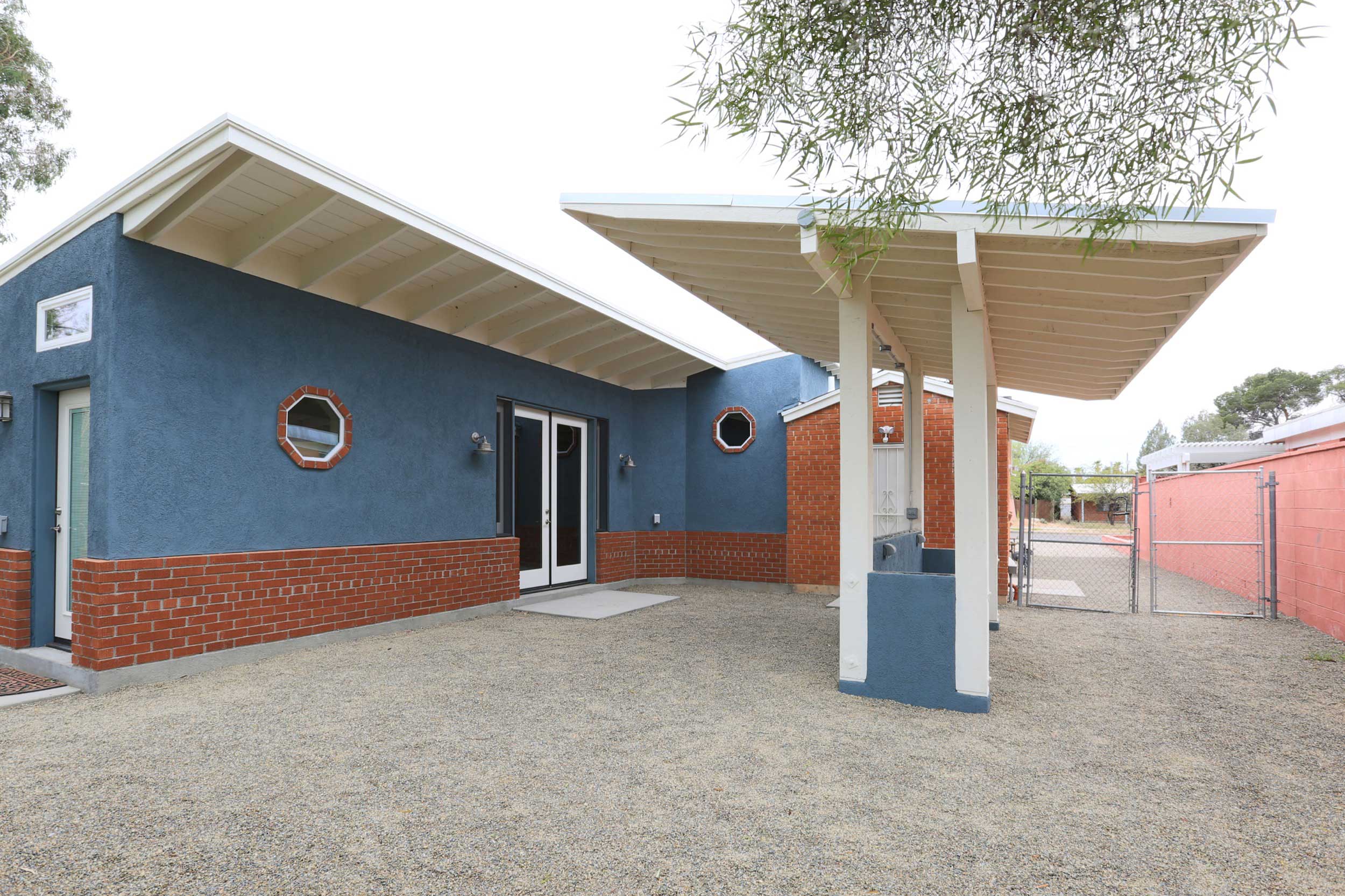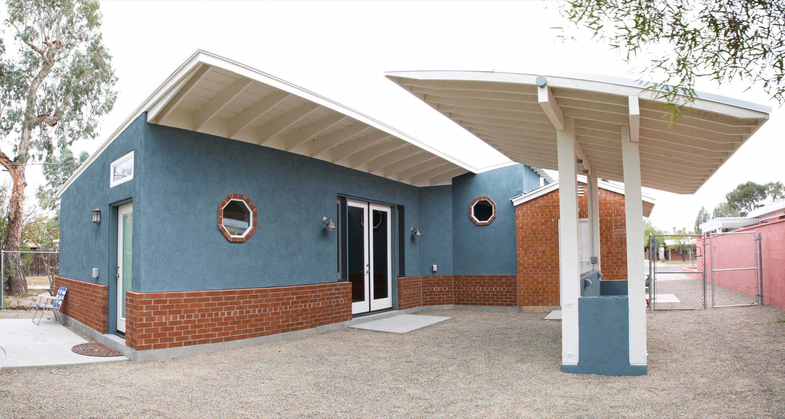 This historic designated home in the Sam Hughes neighborhood located west of the University of Arizona underwent an extensive remodel and addition but one wouldn’t know it when they drive by. The remodel included opening up the small rooms to create one large kitchen which is open to the living space. The existing two bedrooms and bathroom were updated but remained in their original configuration. A large master suite, walk-in-closet and office were added to the rear of the property with a large shed roof. The shed roof is mirrored with a double cantilevered barbeque canopy which creates an artificial “slot canyon” that protects the new west exposure from the brutal western exposure. A brick wainscot helps to tie the addition into the existing double wythe brick walls.