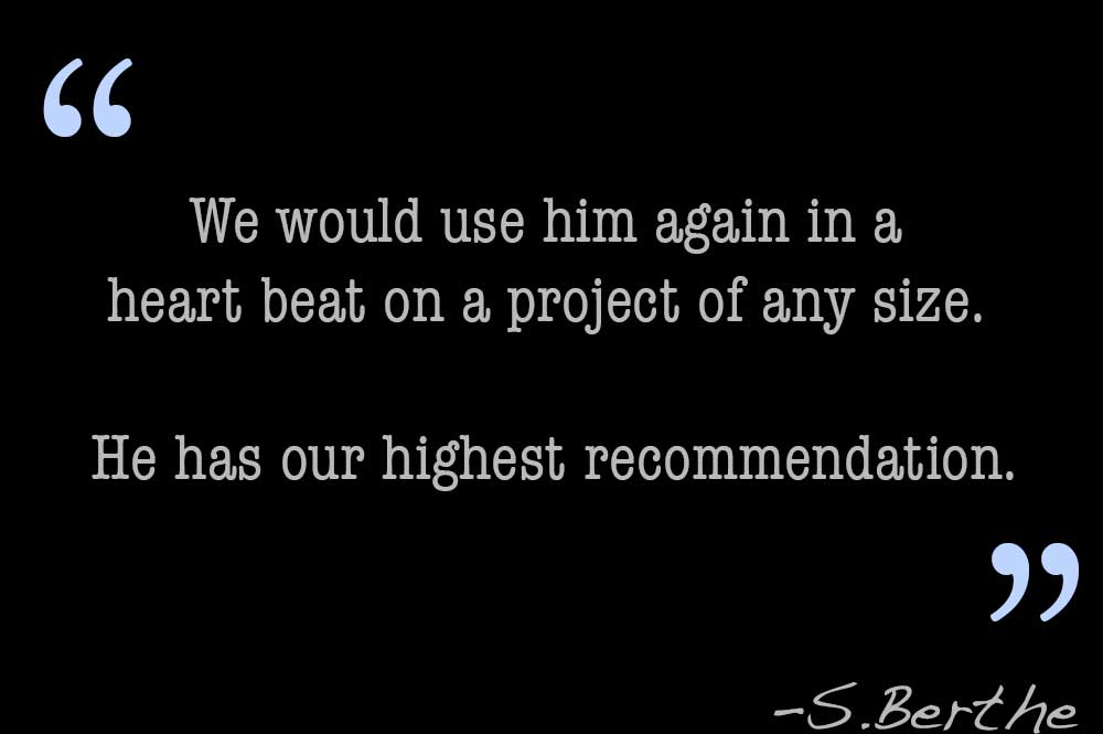 The project came out beyond our expectations. Jake stayed involved throughout. He was always available to help sort through design challenges or options as construction proceeded. We would use him again in a heart beat on a project of any size. He has our highest recommendation.”- S.Berthe