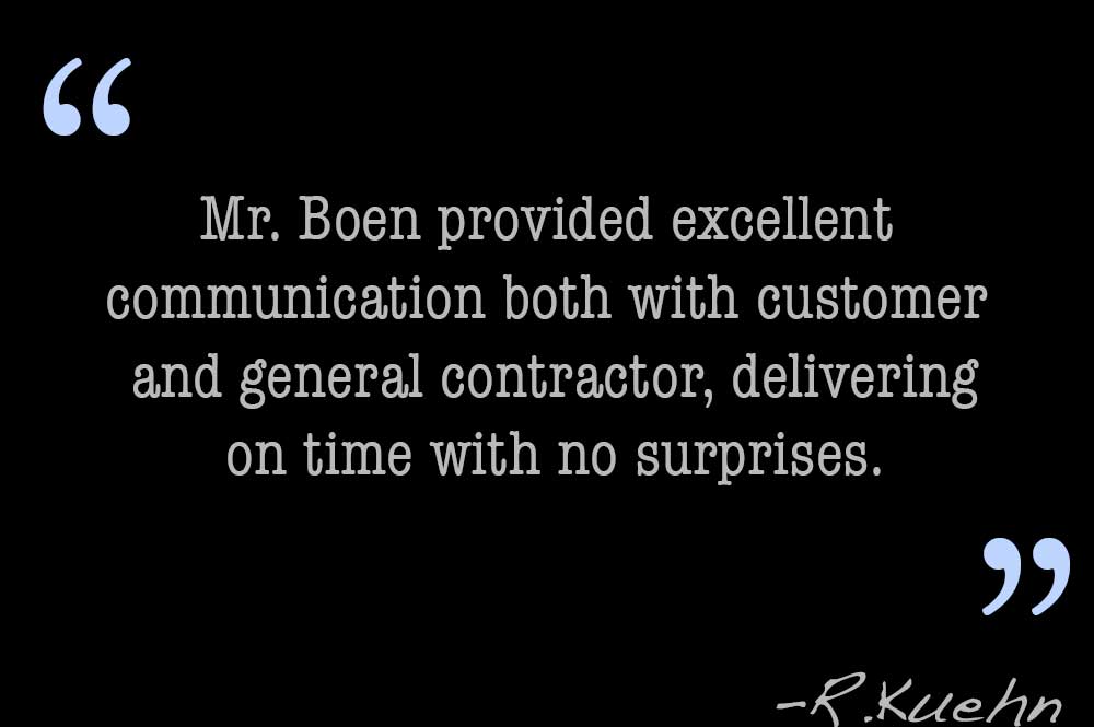 “Mr. Boen worked from the customer's original ideas and delivered designs that enhanced the customer's original concepts resulting in spectacular spaces. In addition to the normal design documents Mr. Boen provided sight line studies (final views of surrounds from strategic build locations) and external views of finished project making it easy to visualize the final product prior to build. Mr. Boen provided excellent communication both with customer and general contractor, delivering on time with no surprises. He handled design changes well (customer requested investigations of major design change ideas mid build) by supporting necessary modifications and providing unplanned feasibility studies. Mr. Boen suggested ways to improve our kitchen layout, which we incorporated into the design and are extremely pleased with the end product.”