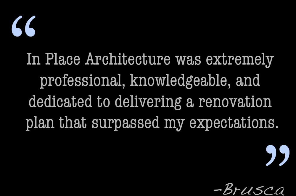 “In Place Architecture was extremely professional, knowledgeable, and dedicated to delivering a renovation plan that surpassed my expectations. Jake's expertise and ingenuity allowed me to renovate my house into the home I had envisioned while keeping me at a budget I could afford. While I was deployed to Afghanistan, In Place Architecture worked with me via phone, email, and Skype to capture what I wanted for my home into real plans a builder could use.”