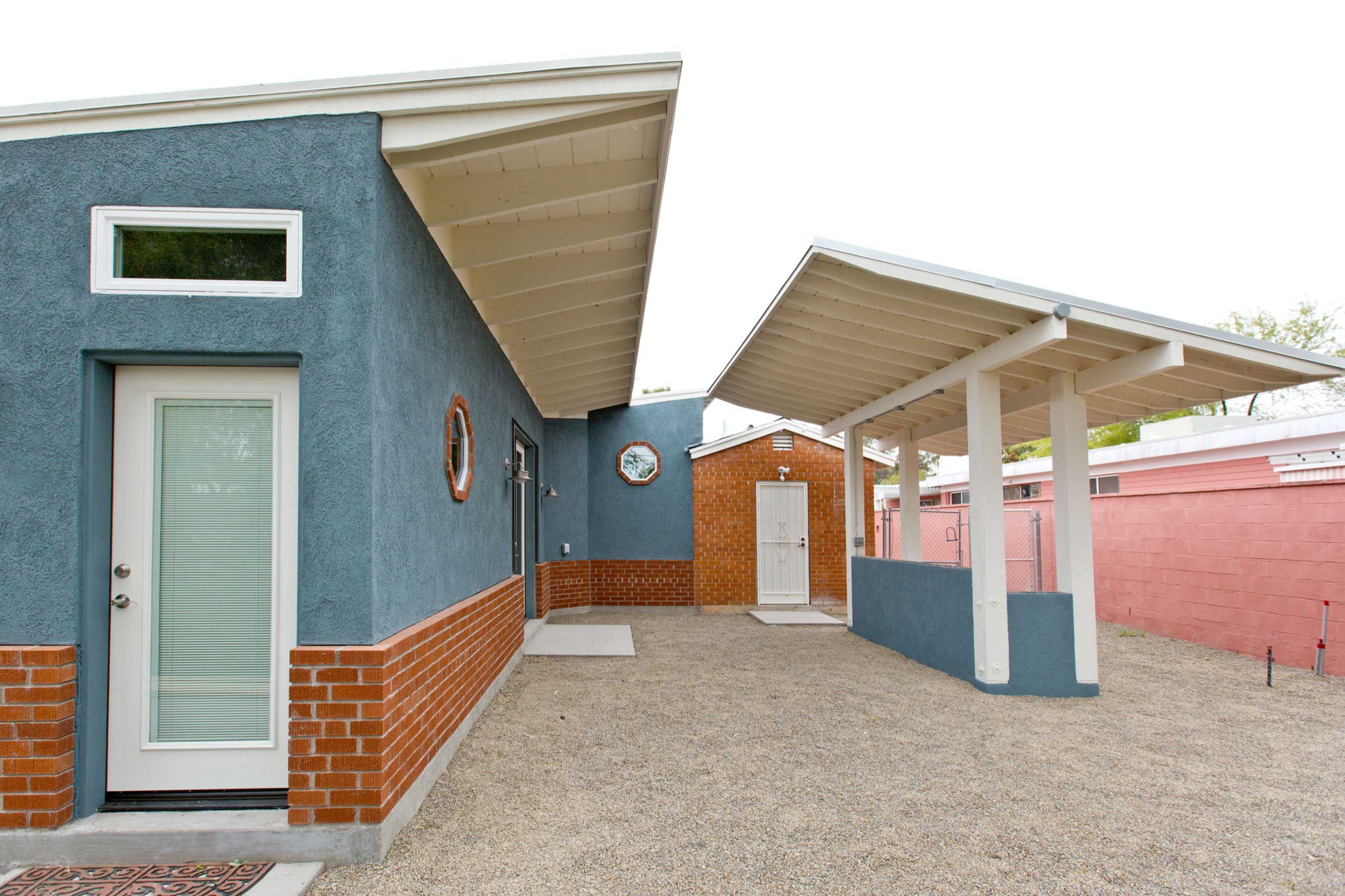 This historic designated home in the Sam Hughes neighborhood located west of the University of Arizona underwent an extensive remodel and addition but one wouldn’t know it when they drive by. The remodel included opening up the small rooms to create one large kitchen which is open to the living space. The existing two bedrooms and bathroom were updated but remained in their original configuration. A large master suite, walk-in-closet and office were added to the rear of the property with a large shed roof. The shed roof is mirrored with a double cantilevered barbeque canopy which creates an artificial “slot canyon” that protects the new west exposure from the brutal western exposure. A brick wainscot helps to tie the addition into the existing double wythe brick walls.